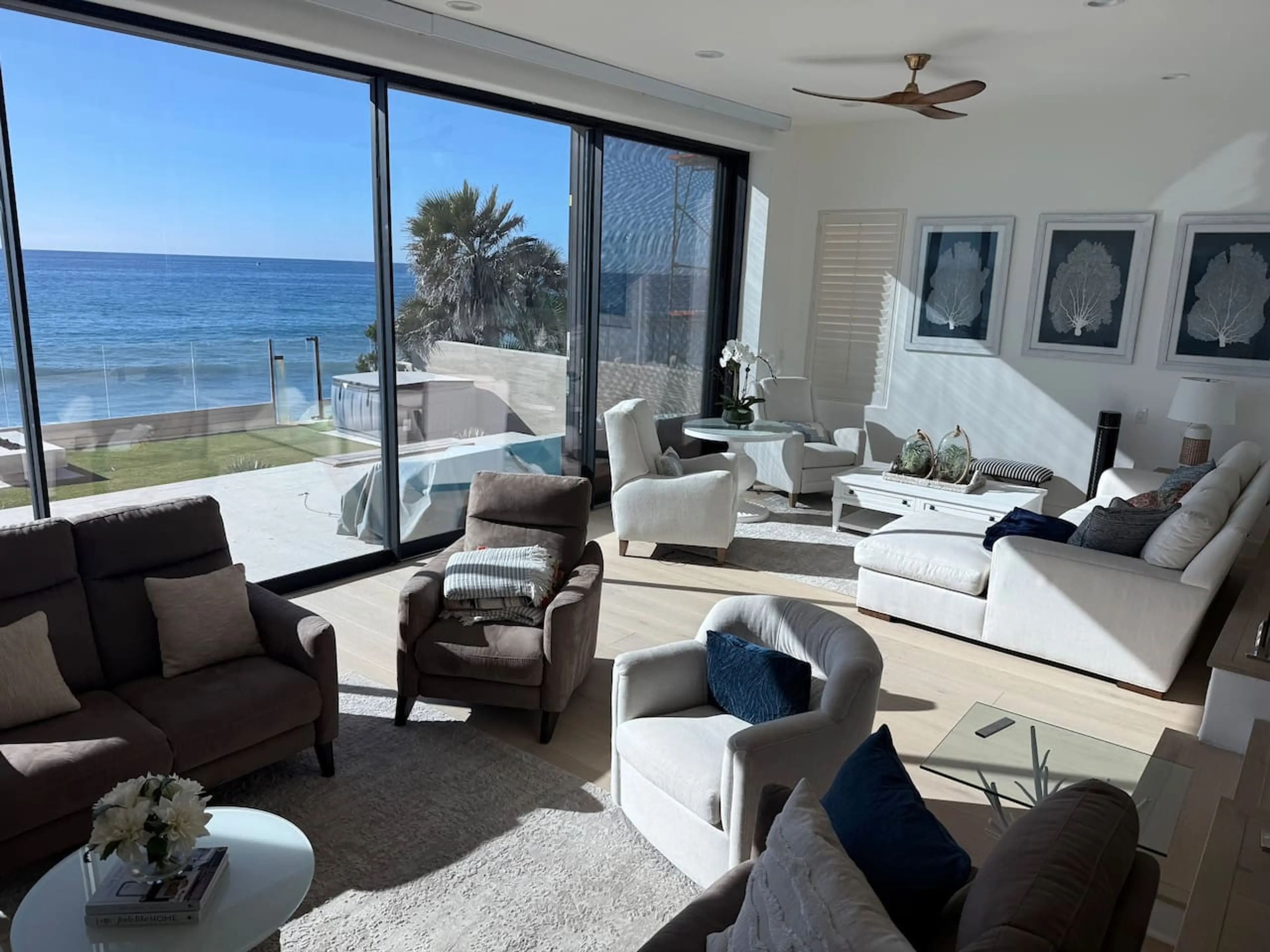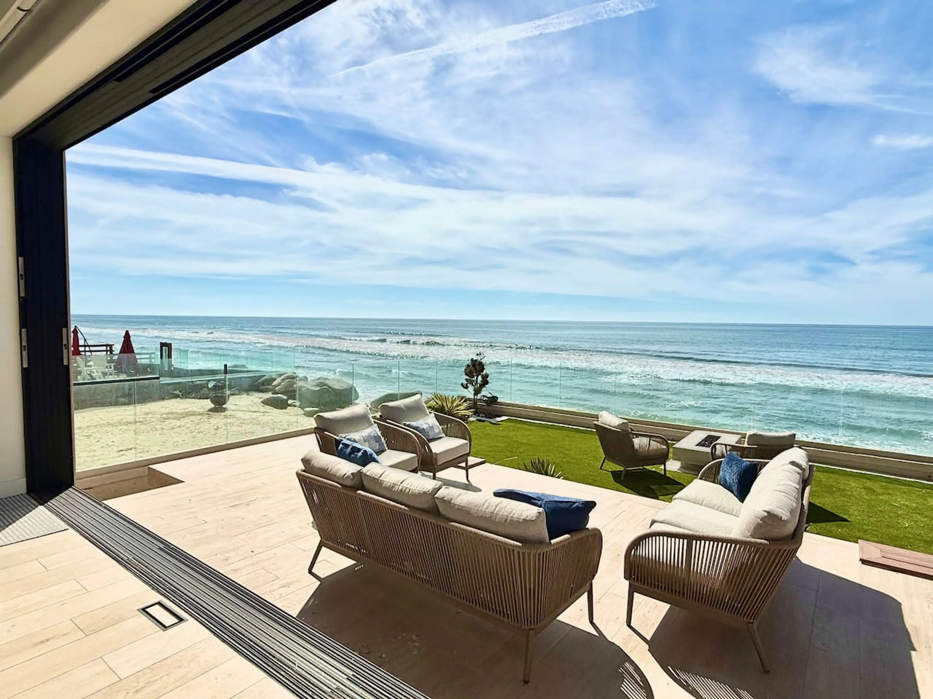 Brand new on the vacation rental market, this is a stunning and elegant beachfront home in Oceanside, easily one of the best beach houses in Southern California. This home features a huge panoramic door in the living room so the ocean becomes part of the house. Enjoy sitting next to your beach bon...